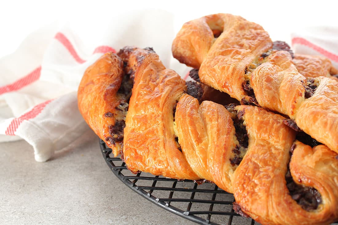 An irresistible recipe for pure-butter croissant dough, with the sweet taste of confectioners custard and chocolate chips.